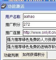 分软件增强功能需要用推广积分进行激活。 积分规则: 1 在www.onlyit.cn论坛注册一个用户(请确保邮箱能收到来自onlyit.cn激活邮件),作为本界面中的用户 名和密码(请妥善保管); 2 在本界面中输入用户名和口令,获得推广连接串; 3 把连接信息发给您的朋友们,他们点击后您的推广积分将增加(每个独立IP计算1分,1 个月内每个IP只计算一次); 4 激活辅助软件功能或者申请正式许可扣除相应的积分。 |