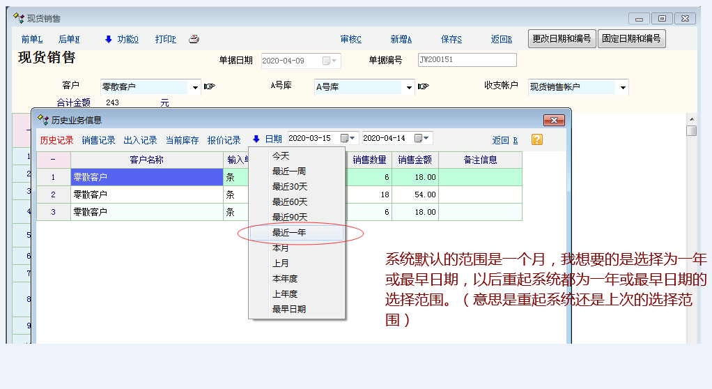 其它不要求有这个脚本接口,只要有选择的记忆功能就可以,像我这次选择的是最近一年,以后每次用的时候都是默认选择最近一年就可以了,现在系统默认一个月时间太短了,像做零售这样来操作,步骤比较频繁了,浪费时间。