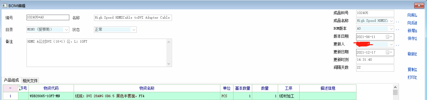 启用扩展属性1-8 扩展属性1:成品料号,字符型,脚本自动生成 扩展属性2:成品名称,字典型:产品资料字典,输入成品料号从产品资料里面匹配出成品名称并提取成品料号到扩展属性1 扩展属性3:BOM版本,字典型:自建BOM版本字典,从字典里面选择 扩展属性4:版本日期,日期型 扩展属性5:更新人,字典型:操作员字典,脚本提取登录操作员账号 扩展属性6:更新日期,日期型,脚本生成当前日期 扩展属性7:更新时刻,字符型,脚本生成当前时刻 扩展属性8:间隔天数,字符型,脚本提取创建日期,计算创建日期和更新日期之间的天数 BOM编号= 成品料号*版本号,脚本自动生成 BOM名称= 成品名称,脚本自动生成 BOM备注:默认脚本提取产品资料的其他描述,保存前可手动修改 为防止误操作,隐藏编辑界面的删除按钮,需要的时候用F9显示出来,默认使用脚本锁定BOM明细内容,添加保存按钮右键修改菜单,点击修改菜单取消BOM明细锁定和扩展属性2-3及BOM备注锁定 BOM自定义一设置为序号列,在导入BOM保存时按序号排序后再保存 BOM自定义二和三分别设置为自动获取BOM编号和BOM版本日期(在产品资料的产品组成导入BOM的时候通过脚本分解出BOM编号的成品编号部分来和产品资料编号匹配,编号不一致的禁止保存,避免导入BOM的时候选择错误没有被及时发现) |