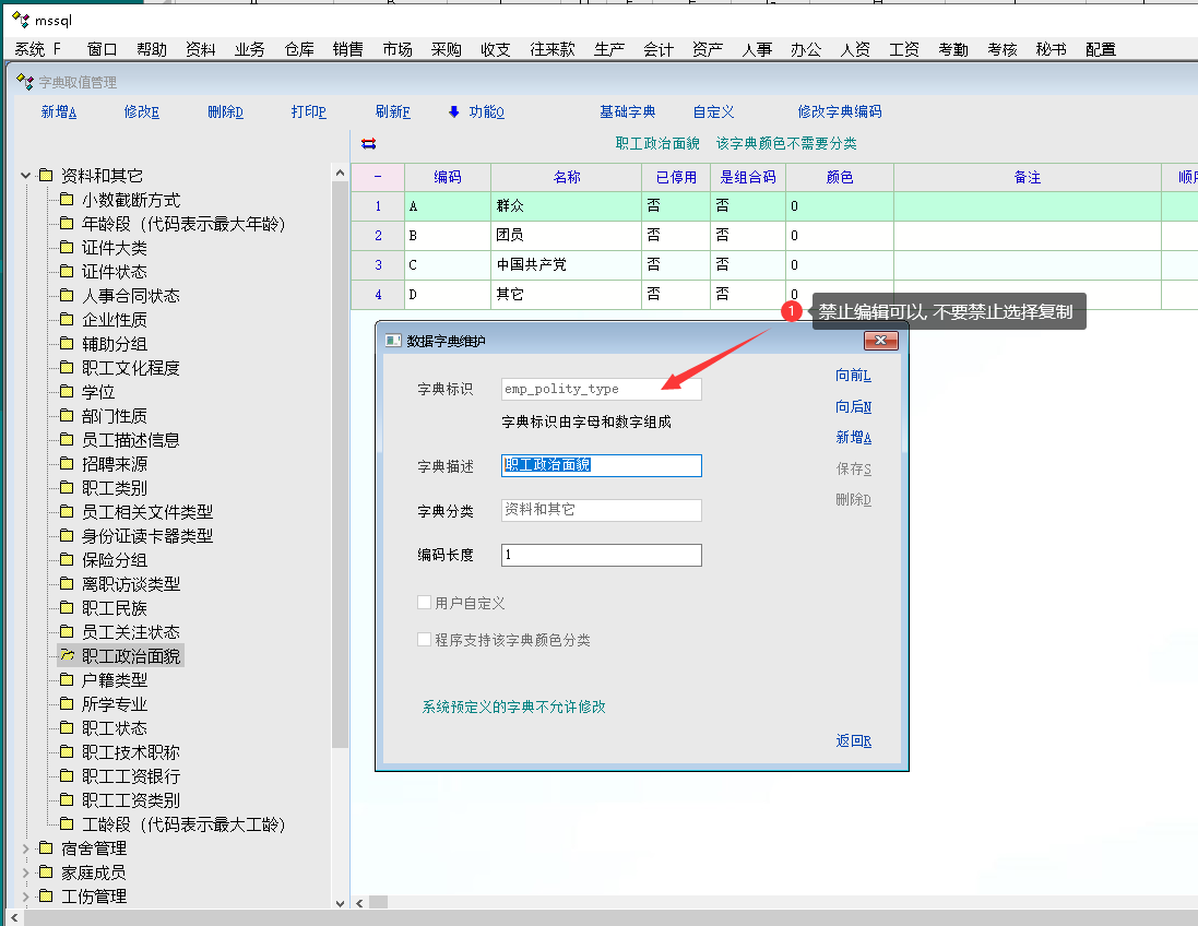 如图, 字典编辑时, 禁止修改字典标识, 但是可以选择复制字典标识. 开发脚本时,经常要用到字典标识,不一定记得, 直接选择复制速度快. 一次节省2秒, 以后也能节省不少时间. |