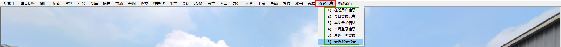 改【在线用户】菜单为【在线信息】,增加6个子菜单,【管理员权限账号查看所有在线用户登录信息】,【非管理员账号查看本人登录信息】。 1.【在线用户信息】 2.【今日登录信息】 3.【本周登录信息】 4.【本月登录信息】 5.【最近一周登录】 6.【最近30天登录】 在【主窗口脚本定义】添加新建菜单脚本 int main() { menu_add_csp("MainMenu",26,'x26','在线信息',''); menu_add_csp("x26",1,'x2601','1】 在线用户信息','在线用户'); menu_add_csp("x26",2,'x2602','2】 今日登录信息','今日登录'); menu_add_csp("x26",3,'x2603','3】 本周登录信息','本周登录'); menu_add_csp("x26",4,'x2604','4】 本月登录信息','本月登录'); menu_add_csp("x26",5,'x2605','5】 最近一周登录','一周登录'); menu_add_csp("x26",6,'x2606','6】 最近30天登录','30天登录'); return 1; }; 增加6个子菜单脚本定义文件【或导入附件脚本文件后自行修改】 1.【在线用户】脚本文件 int test() { return 1; }; int main() { int i,yhsl,count,j; string sql,sql2,yhbh,userIds,uid; uid = get_user_id() get_online_user(); yhsl = db_row_count() userIds=""; for(i=0;i<yhsl;i++); { db_go_row(i) yhbh = db_res(0) if(userIds=="") { userIds="'"+yhbh+"'"; } else { userIds=userIds+",'"+yhbh+"'"; } }; if(is_super_user() == '1') { sql="select user_id as 用户账号,user_name as 用户名称,ip as 登录电脑名和IP,machine_id as 登录电脑机器标识,substring(login_time,0,9) as 登录日期,substring(login_time,9,15)"; sql=sql+" as 登录时刻 from mup_login_log as a where login_time = (select max(login_time) from mup_login_log as b where b.user_id = a.user_id) and user_id in("+ userIds +")"; db_run(sql) count = db_row_count() for(j=0;j<count;j++); { db_go_row(j) db_add_field('登录日期') db_set_value_ext('登录日期', fmt_date(db_res(4),"yyyy年mm月dd日")) db_add_field('登录时刻') db_set_value_ext('登录时刻', fmt_date(db_res(5),"hh:mi:ss")) db_show('【在线用户】登录信息') }; }; if(is_super_user() == '0') { sql="select user_id as 用户账号,user_name as 用户名称,ip as 登录电脑名和IP,machine_id as 登录电脑机器标识,substring(login_time,0,9) as 登录日期,substring(login_time,9,15)"; sql=sql+" as 登录时刻 from mup_login_log as a where login_time = (select max(login_time) from mup_login_log as b where b.user_id = a.user_id) and user_id = '"+ uid +"'"; db_run(sql) count = db_row_count() for(j=0;j<count;j++); { db_go_row(j) db_add_field('登录日期') db_set_value_ext('登录日期', fmt_date(db_res(4),"yyyy年mm月dd日")) db_add_field('登录时刻') db_set_value_ext('登录时刻', fmt_date(db_res(5),"hh:mi:ss")) db_show('【本次登录】信息') }; }; // msg('hello,world'); return 1; }; 2.【今日登录信息】脚本文件 int test() { return 1; }; int main() { int i,yhsl,count,j; string sql,sql2,yhbh,userIds,uid,dlrq; dlrq = get_serv_date() + '%' uid = get_user_id() get_online_user(); yhsl = db_row_count() userIds=""; for(i=0;i<yhsl;i++); { db_go_row(i) yhbh = db_res(0) if(userIds=="") { userIds="'"+yhbh+"'"; } else { userIds=userIds+",'"+yhbh+"'"; } }; if(is_super_user() == '1') { sql="select user_id as 用户账号,user_name as 用户名称,ip as 登录电脑名和IP,machine_id as 登录电脑机器标识,substring(login_time,0,9) as 登录日期,substring(login_time,9,15)"; sql=sql+" as 登录时刻 from mup_login_log as a where login_time like '"+dlrq+"' and user_id in("+ userIds +") order by user_id,login_time asc"; db_run_query_thr(sql) count = db_row_count() for(j=0;j<count;j++); { db_go_row(j) db_add_field('登录日期') db_set_value_ext('登录日期', fmt_date(db_res(4),"yyyy年mm月dd日")) db_add_field('登录时刻') db_set_value_ext('登录时刻', fmt_date(db_res(5),"hh:mi:ss")) db_show('在线用户【今日登录】信息') }; }; if(is_super_user() == '0') { sql="select user_id as 用户账号,user_name as 用户名称,ip as 登录电脑名和IP,machine_id as 登录电脑机器标识,substring(login_time,0,9) as 登录日期,substring(login_time,9,15)"; sql=sql+" as 登录时刻 from mup_login_log as a where login_time like '"+dlrq+"' and user_id = '"+ uid +"' order by user_id,login_time asc"; db_run_query_thr(sql) count = db_row_count() for(j=0;j<count;j++); { db_go_row(j) db_add_field('登录日期') db_set_value_ext('登录日期', fmt_date(db_res(4),"yyyy年mm月dd日")) db_add_field('登录时刻') db_set_value_ext('登录时刻', fmt_date(db_res(5),"hh:mi:ss")) db_show('【今日登录】信息') }; }; // msg('hello,world'); return 1; }; 3.【本周登录信息】脚本文件 int test() { return 1; }; int main() { int i,yhsl,count,j; string sql,sql2,yhbh,userIds,uid,dlrq; dlrq = get_serv_date()-get_week_id(get_serv_date()) uid = get_user_id() get_online_user(); yhsl = db_row_count() userIds=""; for(i=0;i<yhsl;i++); { db_go_row(i) yhbh = db_res(0) if(userIds=="") { userIds="'"+yhbh+"'"; } else { userIds=userIds+",'"+yhbh+"'"; } }; if(is_super_user() == '1') { sql="select user_id as 用户账号,user_name as 用户名称,ip as 登录电脑名和IP,machine_id as 登录电脑机器标识,substring(login_time,0,9) as 登录日期,substring(login_time,9,15)"; sql=sql+" as 登录时刻 from mup_login_log as a where login_time >= '"+dlrq+"' and user_id in("+ userIds +") order by user_id,login_time asc"; db_run_query_thr(sql) count = db_row_count() for(j=0;j<count;j++); { db_go_row(j) db_add_field('登录日期') db_set_value_ext('登录日期', fmt_date(db_res(4),"yyyy年mm月dd日")) db_add_field('登录时刻') db_set_value_ext('登录时刻', fmt_date(db_res(5),"hh:mi:ss")) db_show('在线用户【本周登录】信息') }; }; if(is_super_user() == '0') { sql="select user_id as 用户账号,user_name as 用户名称,ip as 登录电脑名和IP,machine_id as 登录电脑机器标识,substring(login_time,0,9) as 登录日期,substring(login_time,9,15)"; sql=sql+" as 登录时刻 from mup_login_log as 