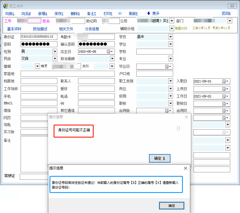 身份证号码的尾号是根据【ISO 7064:1983.MOD 11-2校验码计算公式】计算得来的 官方有自动检查身份证号码是否正确,使用脚本检测后再弹出正确的身份证号码尾号并清空已输入的身份证号码,设置身份证号码为必填项,这样就避免输入错误的身份证号码之后也能保存的弊端 在【员工卡片编辑辅助脚本定义】添加脚本调用 int obj_change() { if(change_obj == "Edit_Paper_Id") { #include 身份证有效性校验 }; //msg('obj change'); //change_obj return 1; }; 把下列脚本复制到新建脚本文件【身份证有效性校验】或下载附件 int main() { dbg_clear() int i,j,count; string paperid,ida,idxs,idb,idjs,xym,sfzws,id18; num id,ida,idb,ids,idjs; paperid = gui_get_val("Edit_Paper_Id"); if(strlen(paperid) == 18) { id18 = str_get_sub(paperid,17,1) str_lst_to_db('7,9,10,5,8,4,2,1,6,3,7,9,10,5,8,4,2') count = db_row_count() for(i=0;i<count;i++); { db_go_row(i) idb = db_res(0); ida=str_get_sub(str_get_sub(paperid,i,1),0,1) idjs = ida*idb db_add_field('校验系数') db_add_field('身份证号码分解') db_add_field('校验结果') db_set_value_ext('校验系数',idb) db_set_value_ext('身份证号码分解',ida) db_set_value_ext('校验结果',idjs) db_set_field_sum_flag('校验结果') }; ids = db_get_sum('校验结果') str_lst_to_db(str_replace(ids/11,".",",")) db_go_head(); idjs = ids - db_res(0)*11 str_lst_to_db('1,0,X,9,8,7,6,5,4,3,2') count = db_row_count() for(j=0;j<count;j++); { db_go_row(j) db_add_field('尾数') db_set_value_ext('尾数',j) xym = db_res_ext('尾数') db_add_field('校验码') db_set_value_ext('校验码',db_res(0)) if(idjs == xym) { sfzws = db_cell('校验码',j) }; }; if(sfzws != id18) { msg('身份证号码有效性验证未通过!当前输入的身份证尾号【'+id18+'】正确的尾号【'+sfzws+'】请重新输入身份证号码!') gui_set_val("Edit_Paper_Id",'') gui_focus("Edit_Paper_Id",'') return 0; }; }; return1; } |