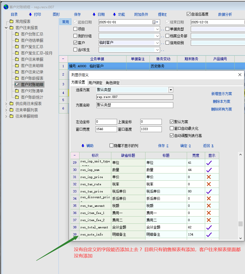 往来报表---客户对账明细,里面的自定义字段没有,能否添加进去?