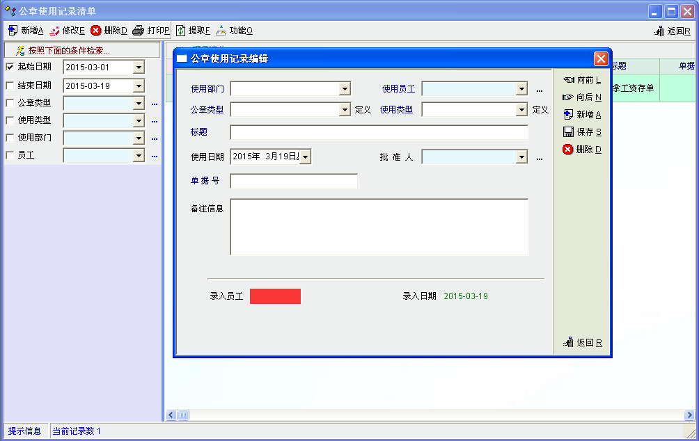我建议下个版本 公章使用记录清单里面新增的话,可以填的选项也太少。最好也可以扩展属性