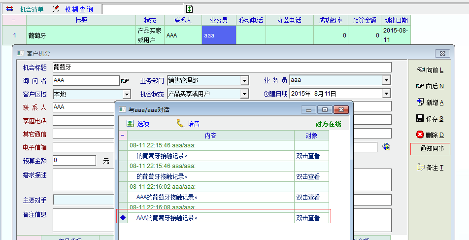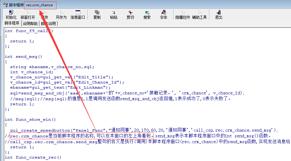 以客户机会中的应用为例,具体脚本如下: int func_f9_call() { return 1; }; int send_msg() { string ebaname,v_chance_no,sql; int v_chance_id; v_chance_no=gui_get_val("Edit_Title"); v_chance_id=gui_get_val("Edit_Chance_Id"); ebaname=gui_get_text("Edit_Linkman"); sql=send_msg_and_obj('同事1,同事2,同事3',ebaname+'的'+v_chance_no+'接触记录。', 'crm_chance', v_chance_id); //msg(sql);//msg(sql)的值是1,1是调用发送函数send_msg_and_obj返回值,1表示成功了,0表示失败了。 return 1; }; int func_show_win() { gui_create_speedbutton("Panel_Func","通知同事",20,170,60,20,"通知同事",'call_csp.rec.crm_chance.send_msg'); //rec.crm_chance是当前脚本程序的名称,可以在本窗口的左上角看到。send_msg表示本脚本程序窗口中的int send_msg()函数。 //call_csp.rec.crm_chance.send_msg整句的含义是执行(调用)本脚本程序窗口(rec.crm_chance)中的send_msg函数,实现发送消息给同事的功能。 return 1; }; |