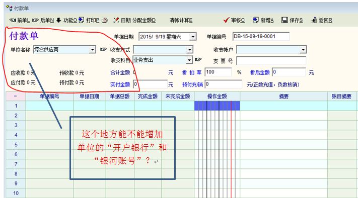 功能--单据参数及配置--单据扩展属性定义,可以配置成字典型(银行账号要在字典中先设置好)方便每次选择。