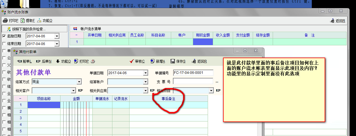 求助_请教各位老师:如何在账户流水账表里面显示 收、付款单里面的事后备注项目的内容_使用经验