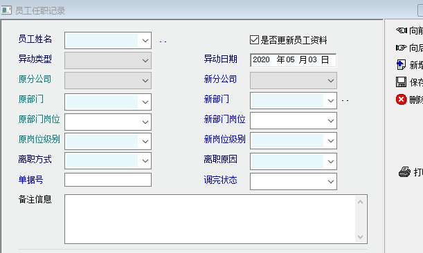 实际工作中,因员工调动存在生效时间问题,为了确保员工工资发放或及时处理员工异动等,一般会及时新增员工异动记录,但时间工作中有暂时不需要更新员工资料的情况!建议不选择 是否更新员工资料 时,异动记录用单独的颜色显示,这样方便后期处理,防止遗忘,也利于实际工作!谢谢