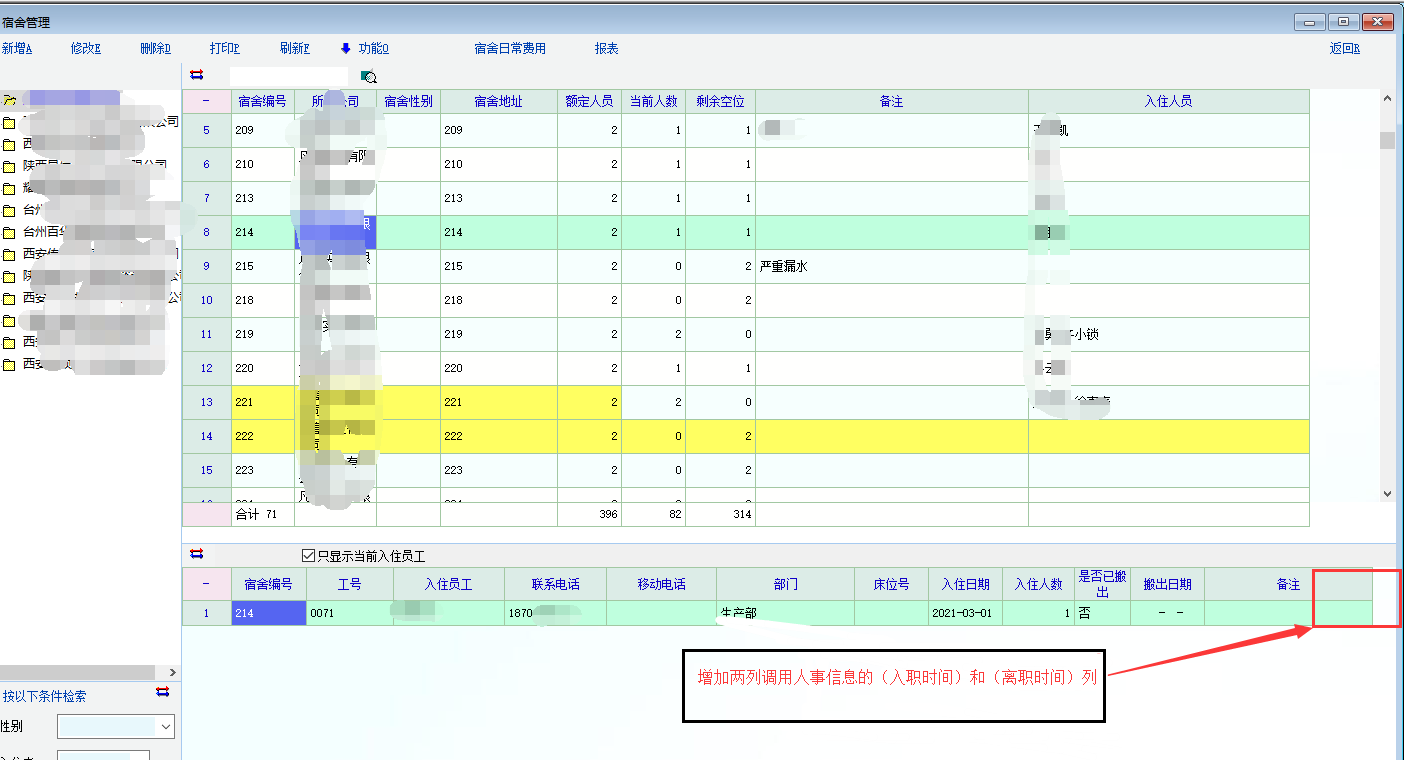 宿舍人员信息增加 显示入职时间和离职时间(调用人事信息),功能能否增加一个凡宿舍人事信息的人有入住宿舍的 ,功能里边增加个筛选人员入住未超过 (含)7天,且已离职的。一键搬出宿舍,搬出宿舍日期按照当天搬出。