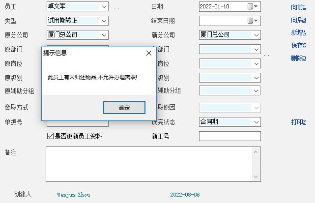 加一个调岗调职类型的判断条件即可 int func_save_rec() { string m_yg,sql,m_lx; m_yg = gui_get_val("ComboBox_Ext_Emp_Id");//获取员工编号 m_lx = gui_get_val("ComboBox_Ext_Post_Move_Type");//获取调岗调职类型 if(m_lx == 'B' || m_lx == 'H')//当调岗调职类型=B或H(离职或退休)时 { sql="select emp_id as 员工编号,emp_id as 员工姓名,dept_id as 部门,res_id as 物品类型编号,res_no as 物品编号,res_name as 物品名称,num as 数量,"; sql=sql+"price as 单价,amount as 金额,io_date as 发生日期,state as 状态,note_info as 备注 from emp_res_io where emp_id='"+m_yg+"' and State in('A')"; db_run(sql); db_map("emp","员工姓名","员工姓名"); if(db_row_count()>0){ msg('此员工有未归还物品,不允许办理离职或退休!'); can_save=0; db_show('员工未归还物品明细'); }else{ can_save=1; }; }; //msg('save rec'); //can_save=1; return 1; }; |