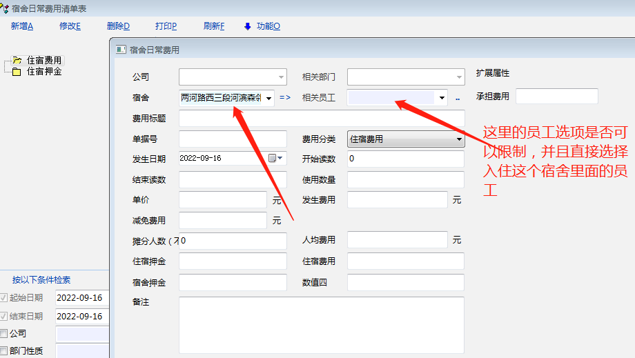 宿舍管理---宿舍费用里面新增宿舍费用时,选择相应的宿舍,那么选择员工时,能否直接跳出,这个宿舍里面相对应的入住或者搬出的员工?而不是去员工资料里面随意选择员工?