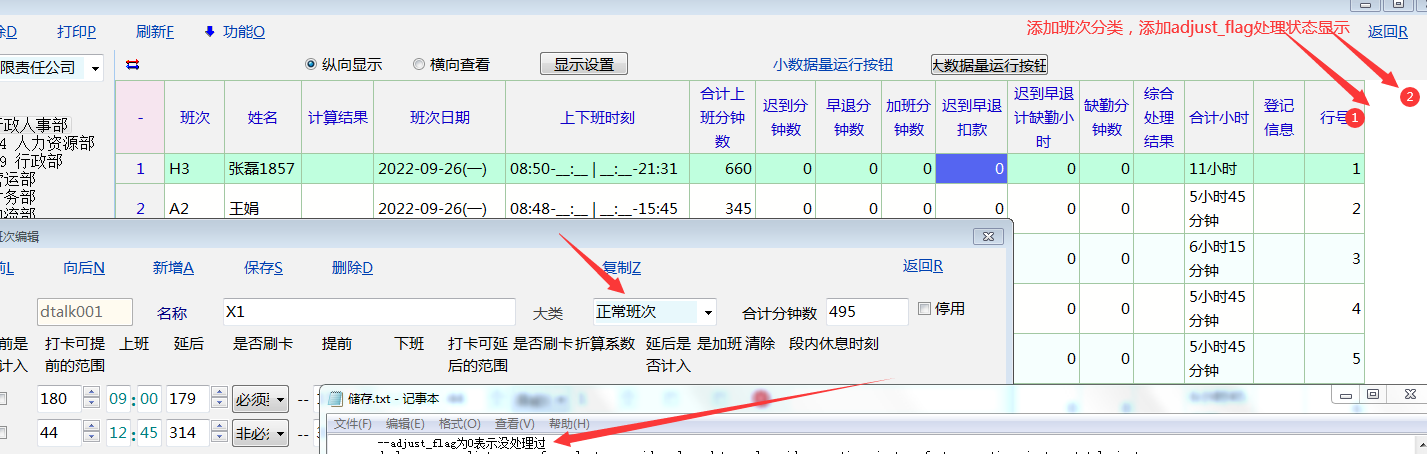 原创_考勤日帐界面---这里再添加班次里面新增加的大类显示与脚本处理状态的显示_人力资产