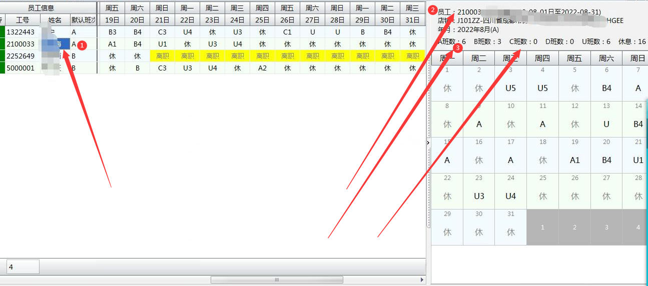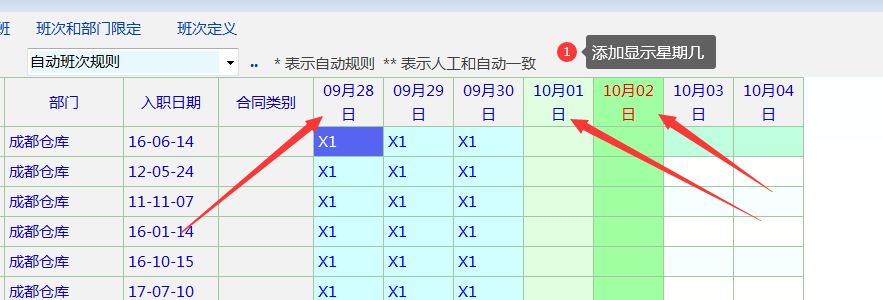 员工排班里面把“星期”也添加到日期里面,可以在查看的同时,一目了然明白是星期几。按天排班是有的,但自动规则里面的排班里面是不显示的。还有参考一下图片所示:员工排班界面显示一个月的排班,界面上点击哪个员工,右边窗口或者信息条能够显示这个员工这个月的排班统计信息。弥补考勤管理里面缺少对排班班次数据的统计(不是统计具体班次时间)
