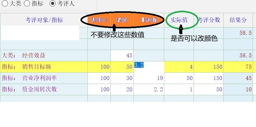 2.实际上所谓的评分就是只填实际值就好了,分数可以通过脚本自动计算出来, 为了让那些老家伙便于区别知道填到那个列里面, 是否可以更改实际值的颜色,比如改成红色或其他颜色,便于区别