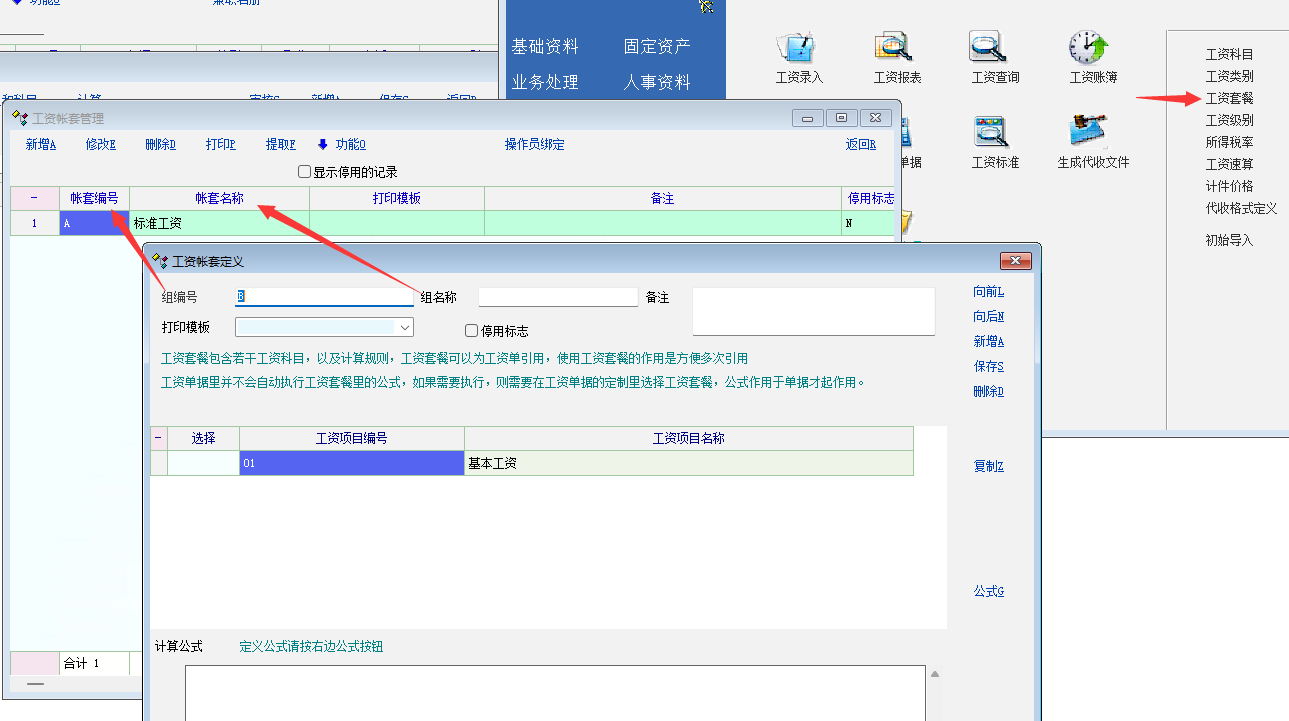 如图中:工资套餐新增时, 组编号, 组名称 。 建议更换为账套编号, 账套名称