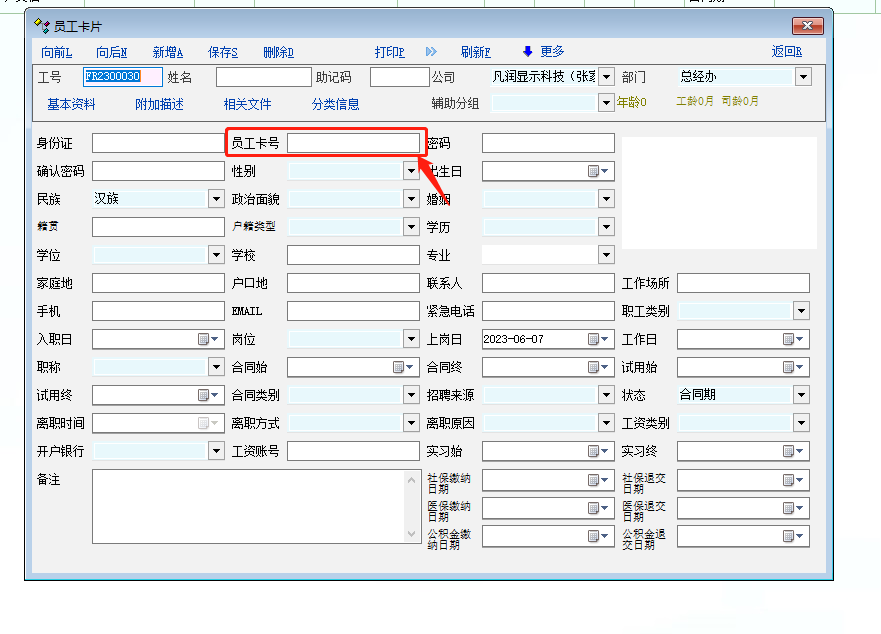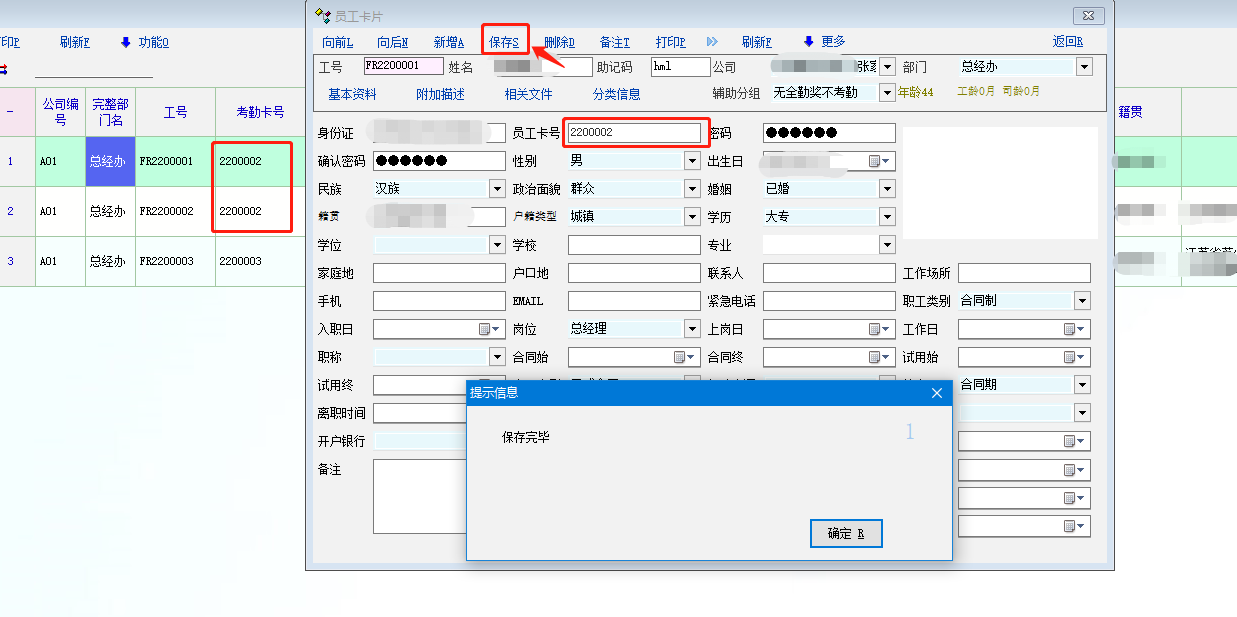 你说的这个系统防呆提醒在修改完员工卡号的时候点保存是不会提示的,只能在下一次打开员工资料界面的时候才能提醒,这个还是有弊端的,最好是在点击保存的时候系统可以检索一下数据库中是否有重复的员工卡号,如果有重复的程序直接返回不进行插入的数据库的动作!!!这样才能完全避免重复的发生