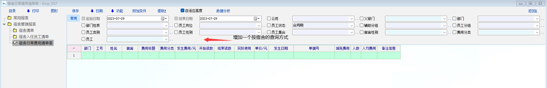 建议在宿舍日常费用清单表-Emp_057里增加一个按宿舍为条件的查询方式