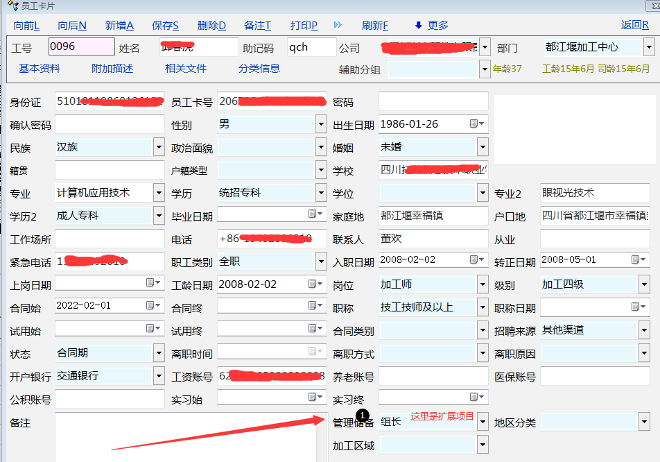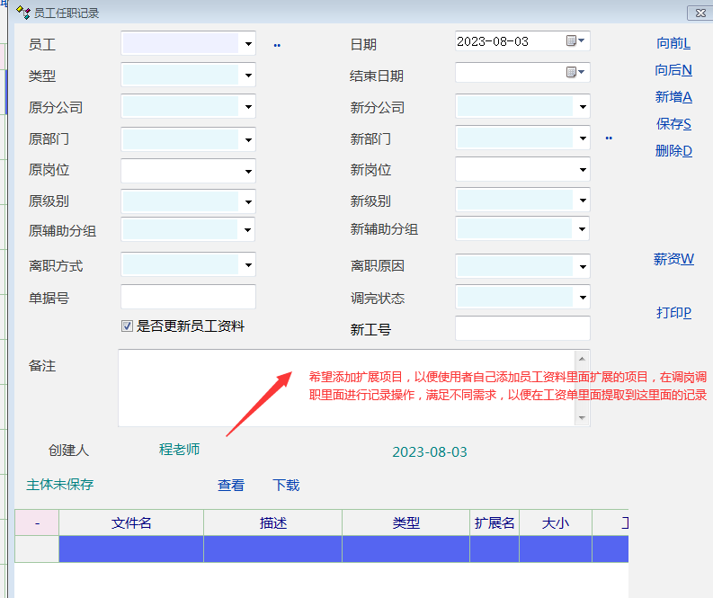 因一些客户,员工资料里面的项目不能够满足需求,所以使用了一些扩展项目,这些扩展项目在实际应用中,需要使用调岗调职来进行调整,但调岗调职里面没有扩展项目,没有办法来关联员工资料里面的扩展项目