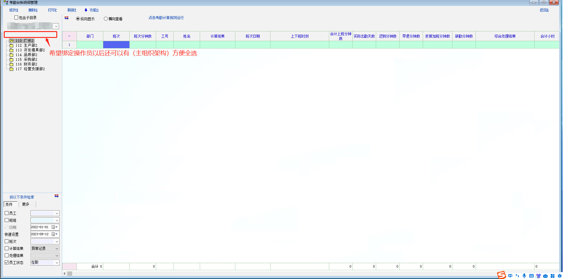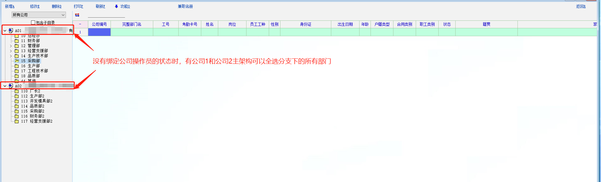 我们的目前的情况是一套人事系统分别给总公司和下面的分公司人事人员同时使用,为了达到互相数据不共享的目的我们进行的公司操作员绑定,这样各自的人事人员就只能看到自己要操作的公司人员数据了,实际使用过程中发现绑定完操作员以后所有涉及到选择人员的地方主的组织架构就没有了,在操作一些数据需要全选分支下面的所有部门人员的时候就很不方便了,希望老师可以考虑增加一下此需求,感谢!!!!
