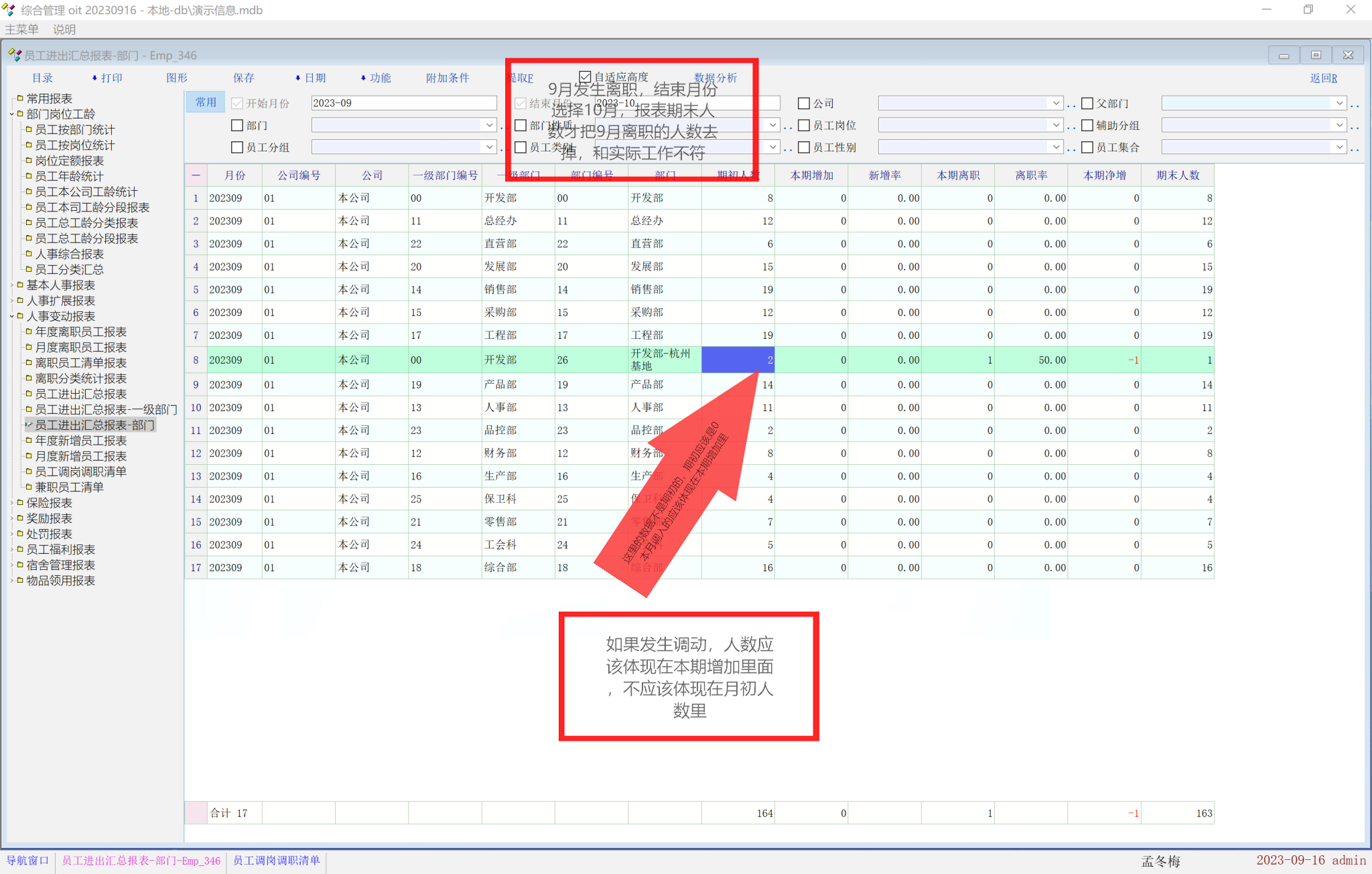 目前主要的问题就是 员工调入的人数不应该体现在月初人数里 应该体现在 本期增加 里  本期离职的数据 如果报表要体现  结束月份要推后一个月才行!