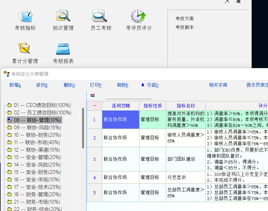 一、绩效考核--考核指标-新增-增加大类项下,增加一至二层。理由一是对于设有分公司、部门等层级较多的公司,设置时比较方便控制。二是在累计分管理模块中更能有效管理细项。希望能采纳,谢谢!