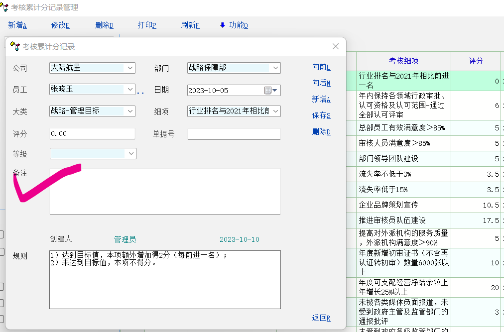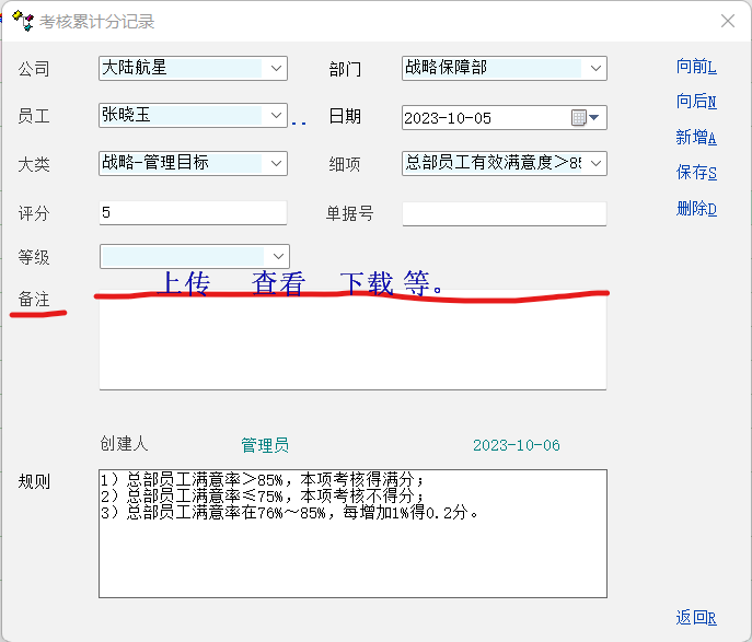 还有一点建议:在“累计分管理”项下,新增块中的备注栏增加上传-查看-下载等按钮,如把得分重要依据性文件、图片等信息上传,作为得分的依据,以备验证。