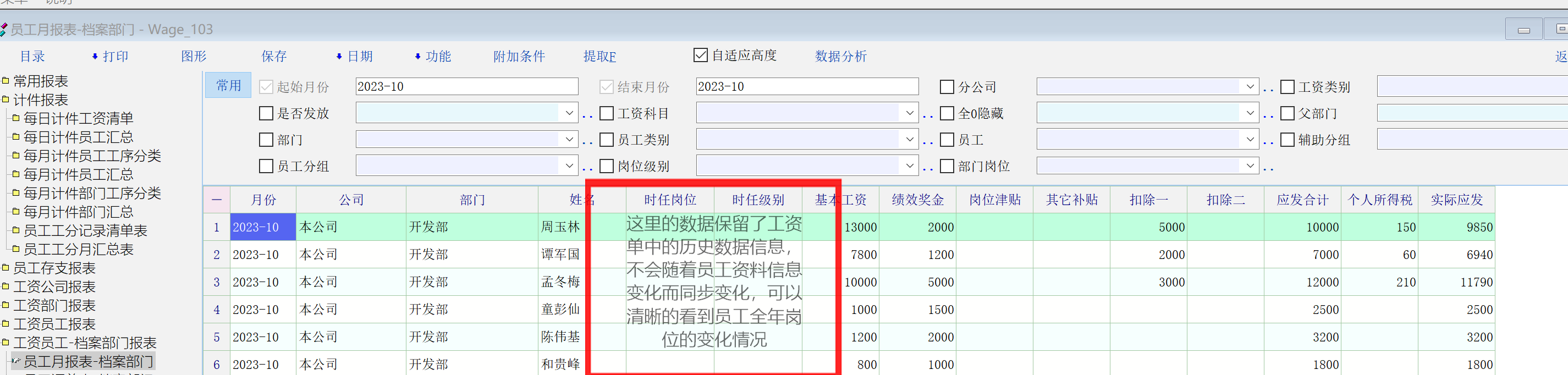 类似员工工资月报表-档案部门中的时任岗位 时任级别功能