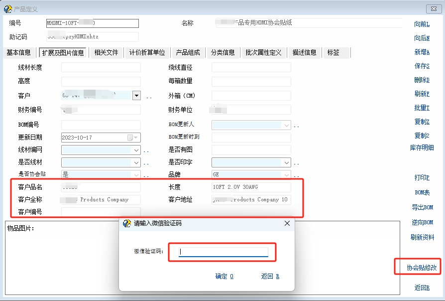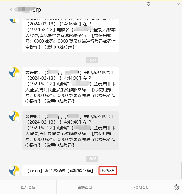 例如我就在产品资料里面锁定了几个产品附加扩展属性的输入框,添加了一个有增删改权限的人员才能看到的【协会贴修改】控件,点击这个控件,会发送验证码到有协会贴资料审批权限的人员的企业微信,输入正确的验证码后才会解锁这个几个产品附加扩展属性进行修改 if(have_role("0005")==1) //有产品资料增删改角色权限编码 { gui_create_speedbutton("Panel_Func","xhtxg",x,y*2,w,h*2,"协会贴修改","call_prog.a3_csp"); gui_set_hint ("xhtxg", '【jasco协会贴固定项目】解锁,需要输入【审批人员的企业微信】收到的【验证码】才能解锁!'); }; a3_csp脚本 int test() { return 1; }; int main() { string SuiJiShu,SuiJiShu1,SuiJiShu2; num SuiJiShu,SuiJiShu1,SuiJiShu2; SuiJiShu1 = rand() SuiJiShu2 = get_serv_time()//取服务器当前时刻 SuiJiShu = SuiJiShu2+SuiJiShu1 //服务器当前时刻-随机数 send_qywx_notify('FanWenJun','【jasco】协会贴修改【解锁验证码】:'+SuiJiShu); inp_clear(); inp_para_set_title('请输入微信验证码') inp_def_string('mnum','微信验证码:'); inp_para() num inp_num; inp_num=inp_get_val('mnum') if(inp_num == SuiJiShu) { gui_enable("ext_sfxht"); gui_enable("edit_khpm"); gui_enable("ext_pinpai"); gui_enable("edit_khqc"); gui_enable("edit_length"); gui_enable("edit_khdz"); gui_enable("edit_khbh"); }else{ msg('验证码错误,请重新操作!'); return 0; }; return 1; }; |
