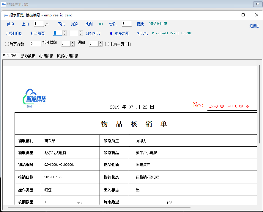 进出记录打印单和核销打印单都调取了物品领取单(emp_res_io_card)模版