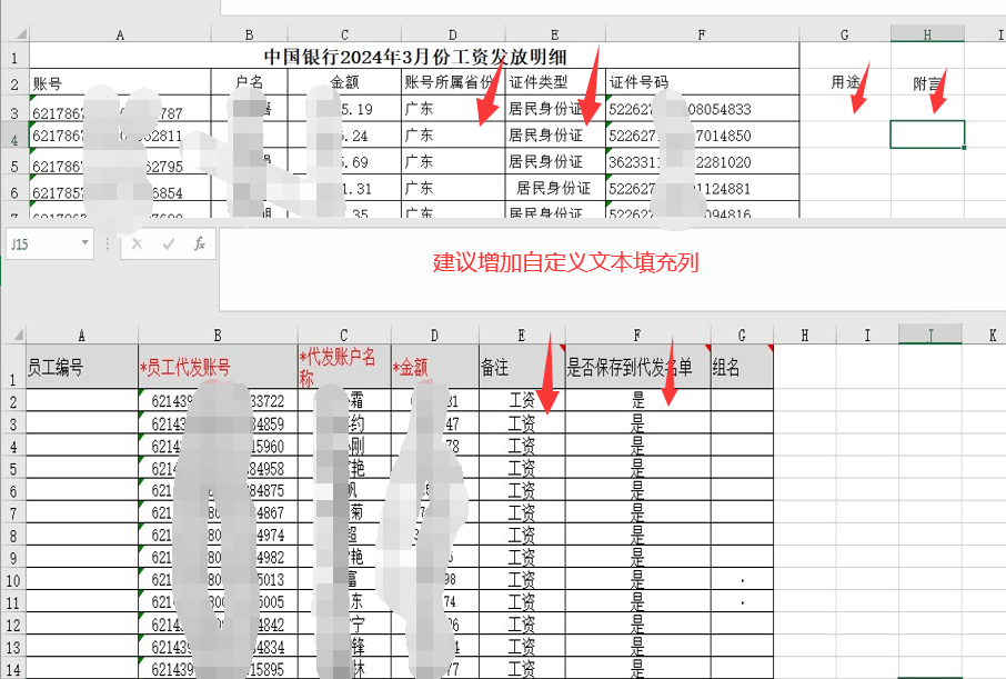 2.建议增加可自定义填充文本的列,比如:备注:工资, 附言,居民身份证、地区等,与银行格式更相符