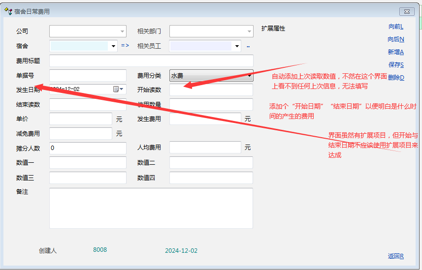 费用管理里面----界面上的“开始读数”--应该自动读取上次数值,而不是手工去添加,如果错误,可以手工修正。开始读数-----结束读数------如果上个月有登记,那界面上应该自动读取到或者界面上哪里可以一目了然看到上次的结束读数