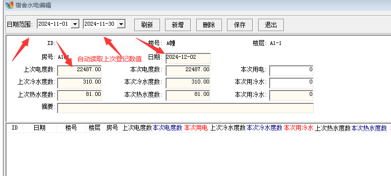 原创_宿舍管理---费用管理里面添加起止时间选项----开始读数--自动读取上次数值_人力资产