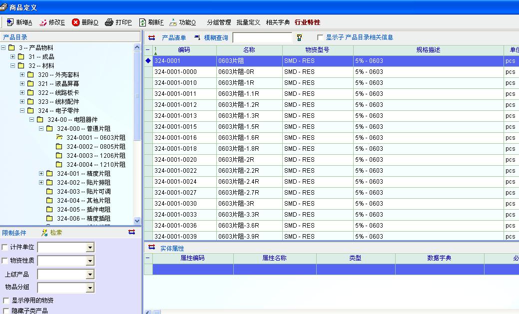 还有我觉得“名称”和“物资型号”的作用好像是互换了,一般我们习惯叫“15寸液晶屏”为物品的名称,但15寸屏有很多牌子和型号的屏,因此我认为商品定义里应该是名称可以相同,物资型号才是不能相同,又如:名称叫贴片电阻,但型号里分很多个阻值。现在我们只能将“名称”定义为不同阻值的电阻型号,而“物资型号”里定义为相同的名称。