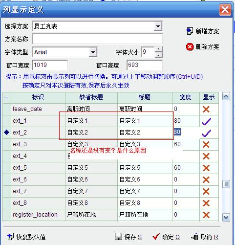 我已启用了2个扩展属性后(图1),当我返回员工资料,在显示上面自定义的名称还是没变,还是“自定义”,进入到显示定制里面(图2)看也是没改过来,请问是什么原因?
