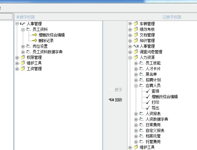 主要是将《员工资料》增删改综合编辑的权限,授予的话操作员就能删除员工资料记录,《删除记录》的权限就没有用。而《应聘人员》登记卡在将《员工资料》增删改综合编辑的权限回收时,就不能录取建档。