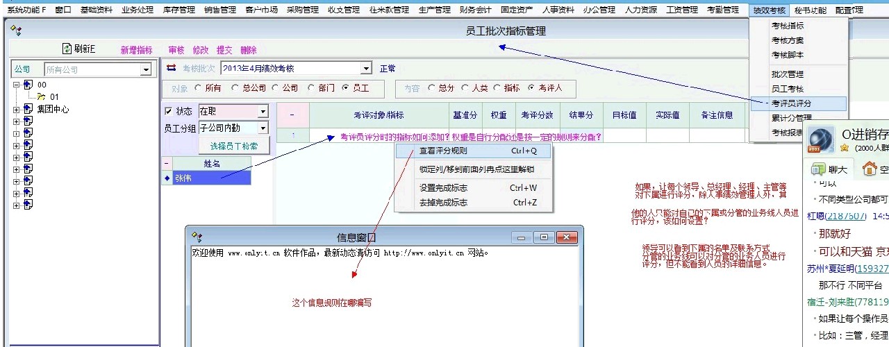 目前,系统考核信息没有审核环节,就像做好了一张报表,或填写了一个数据,如果可以控制这个数据的修改情况,那么,就可以作为一个操作的依据,考评人对一个操作员评分的动作就是修改这个数据的动作,那么,考评人是否可以对下属进行评分,还是上下左右的评分(360度),这里没有这个功能,因为,系统不可能授予每个人都有绩效模块的完全权限,那么,在绩效实施的过程中,对员工考核就成了难题,只能由绩效人员来收集信息并登录系统,