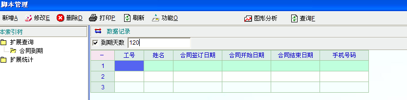 1、打开配置管理,点数据脚本。点左手边,扩展查询,右键增加一个,脚本名称随便填,如提取到期合同。