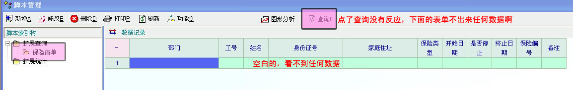 修改后的脚本,在单机模式下面可以使用了,但是在网络模式下,还是无法使用,显示不了任何数据~~~ 而且利用脚本只能显示所有的保险数据,没法实现按条件搜索查找的功能(比如按部门,保险险种,姓名等条件),还是有点不方便。 希望高人能够为我解决困难啊~~~ |