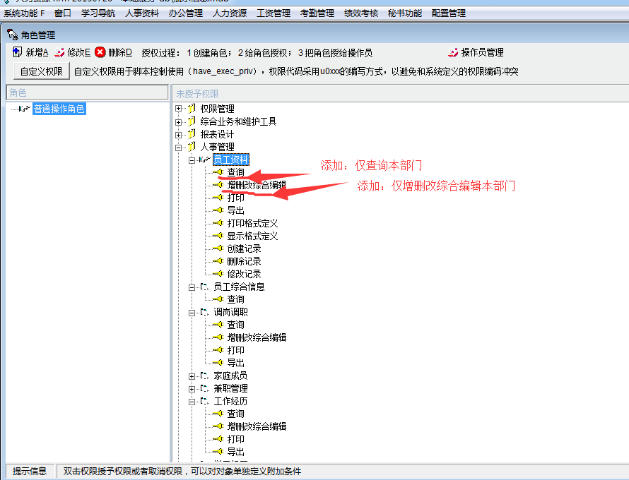 咱们软件是有若干个不同部门的操作员来共同操作的,员工的“个人资料”中的信息有时候是不方便对所有操作员公开的,可不可以在“角色管理”中"授予权限"的时候增加“仅查询本部门”,“仅增删改综合编辑本部门”这两条权限设置,谢谢!