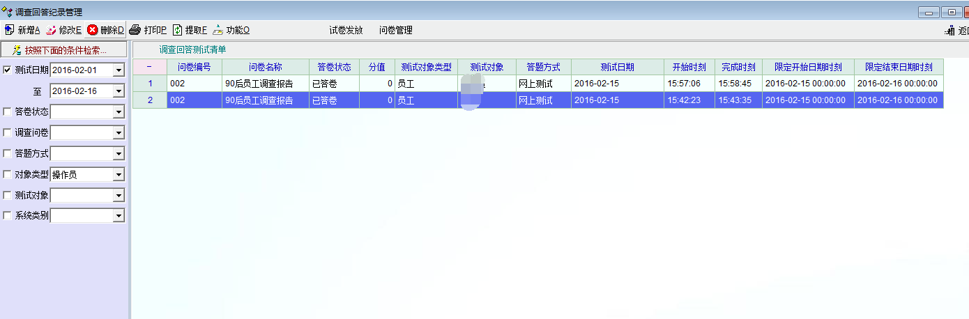 最近测试了软件的”调查、考卷“功能,可以通过外网或者手机填写答卷,这确实要比原来的工作方式要高效,但是也发现了一个问题:答卷管理目前只是针对”考卷“,像”调查“类的问卷不能进行选项的分类汇总和数据分析,例如第一题选A的有多少人,占总人数的多少,分别是哪些人。