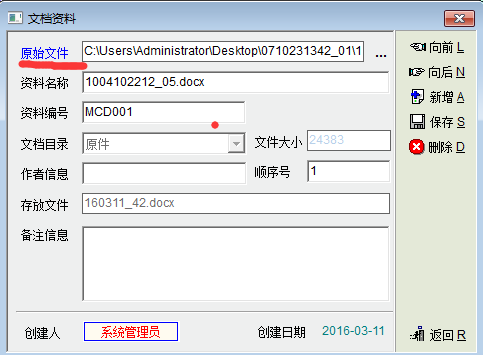 资料属性:见图。资料再增加存放的“资料柜”属性,方便实物查找。原始文件功能增加可选性,不是必要的可以不添加路径。