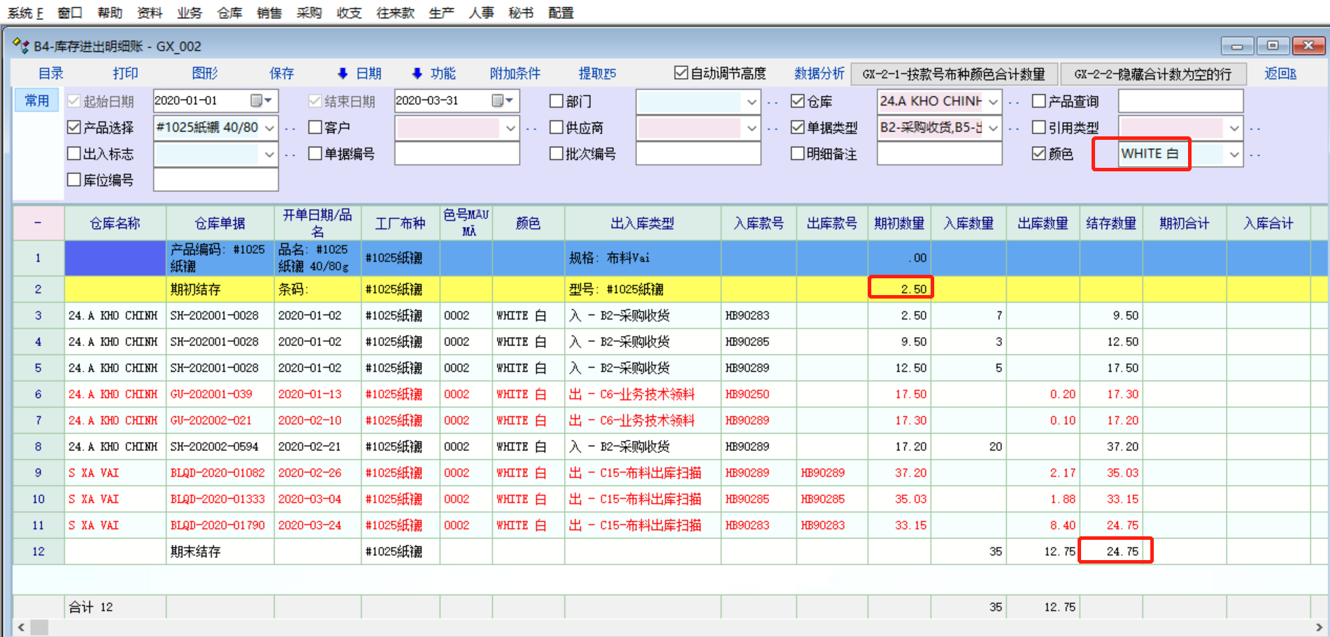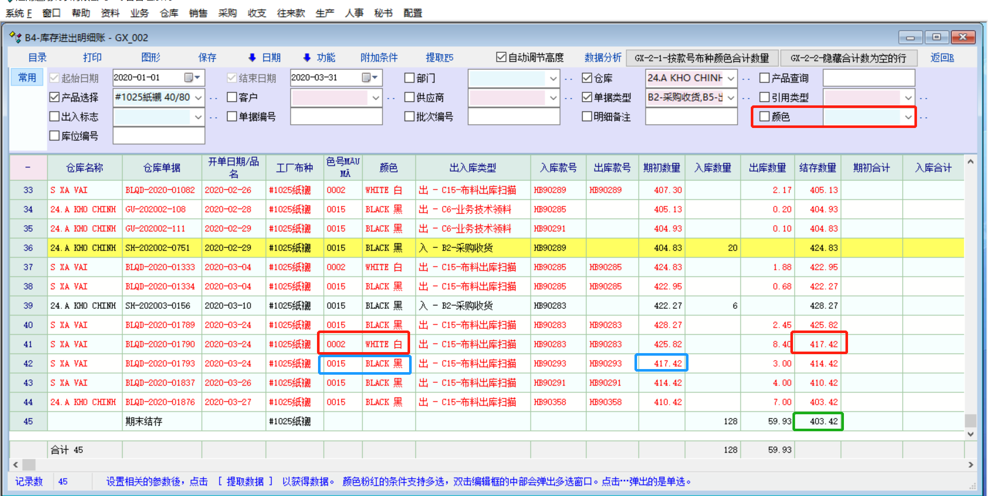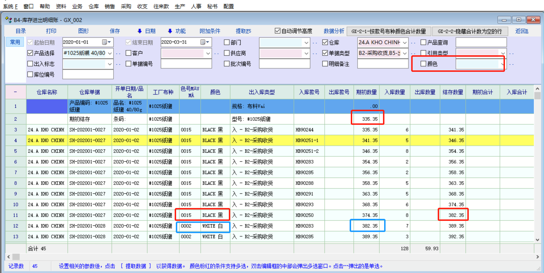原创_库存报表的库存明细账和库存流水账的期初数量和结存数没有区分行业属性(颜色)_产供销