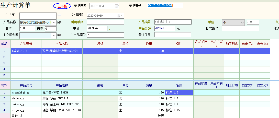 在生产计算单里,能否把产品组成里的更多字段,及自定义字段带出来,比如:损耗率、加工形态等,