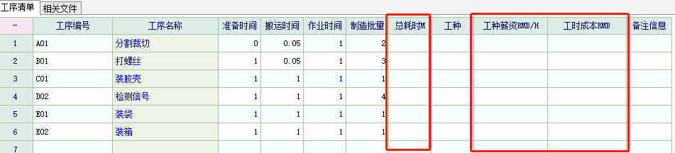 所以我希望在工艺流程编辑界面的表格增加一些字段,用来核算总的加工时间【(准备时间+转运时间+加工时间)*数量)】,同时也需要根据不同的工种【新字段】,从工资标准中调出各工种相对应的小时人工成本【新字段】,最后在综合核算出整体的人工成本【新字段】。最后的界面如附件所示。