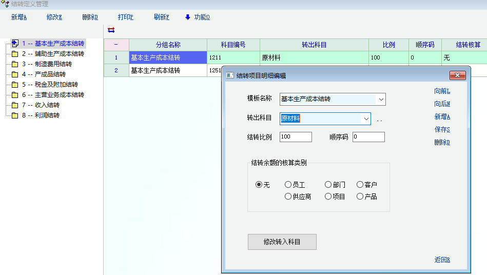 系统在结转定义管理里,缺省定义了“基本生产成本结转”,转出科目为“原材料”,转入科目为“基本生产成本”。