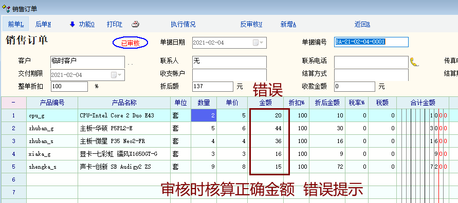 例:  导入数据  2*5=18  审核后  明细数据  2*5=18
