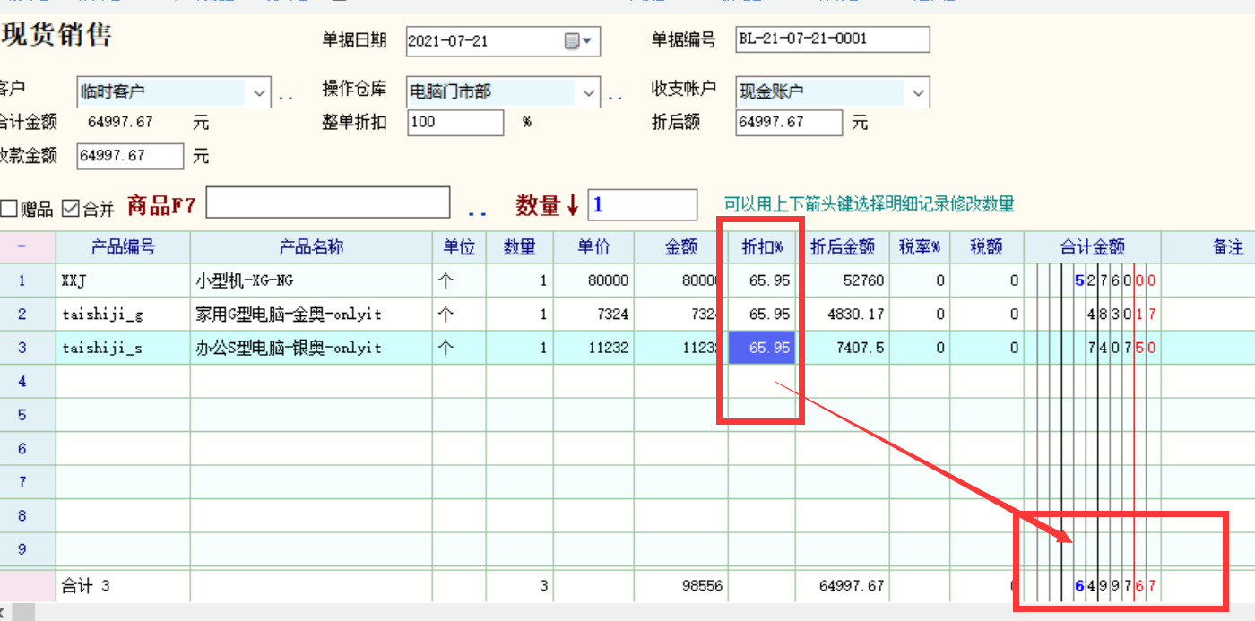 如手动更改每个产品的折扣和成交金额,又因为小数点导致整单金额与实际金额有点偏差