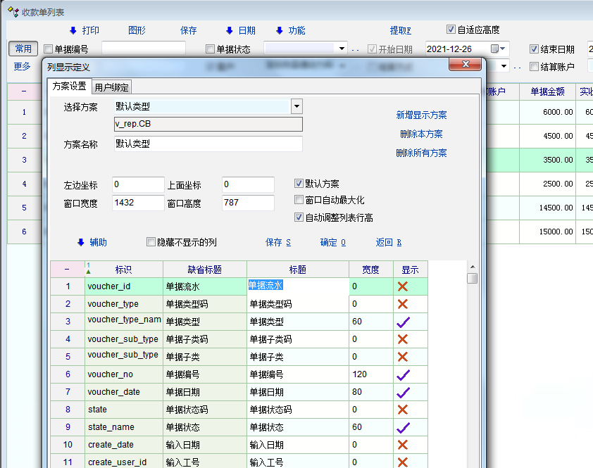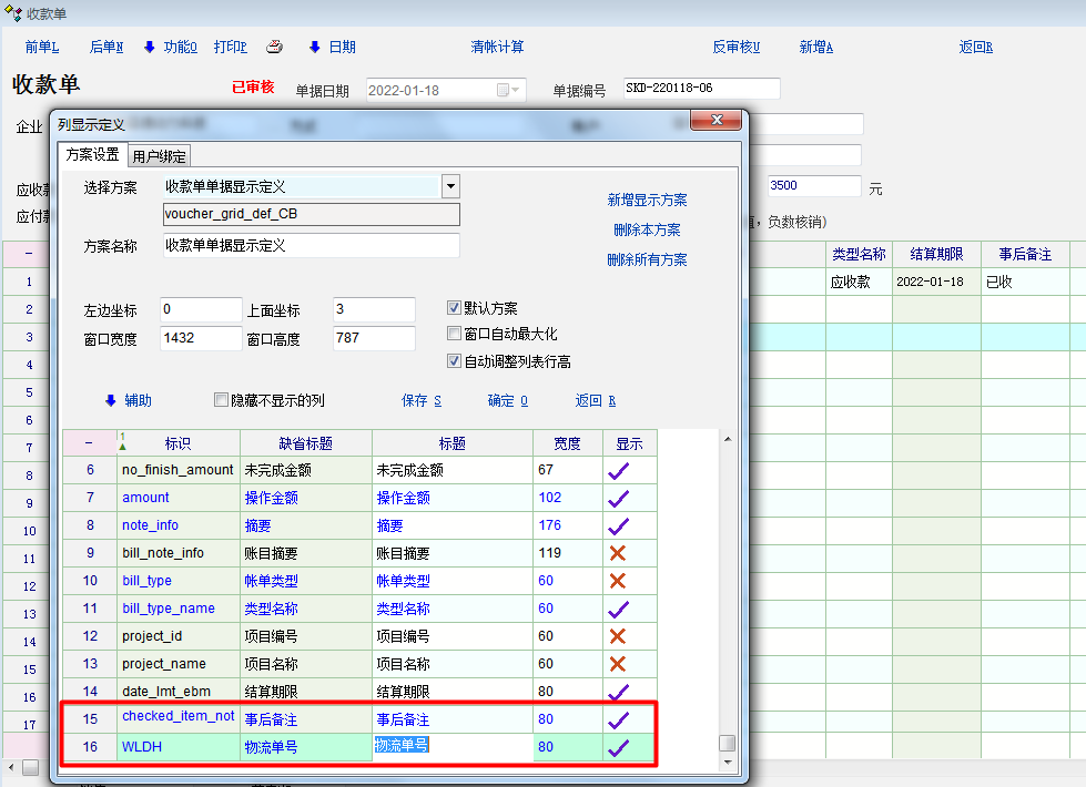 如图,收(付)款单列表不能定制显示事后备注(checked_item_not)和自定义的单据明细附加扩展属性内容,建议添加。