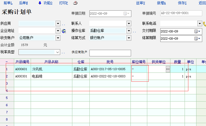 请问怎么在采购计划单单据中根据产品编号自动调取库位