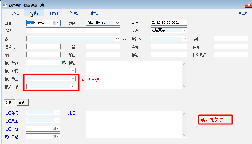 int func_show_win() { int x,y,w,h; x=gui_get_x("ComboBox_Ext_Ass_Emp_Id"); y=gui_get_y("ComboBox_Ext_Ass_Emp_Id"); w=gui_get_w("ComboBox_Ext_Ass_Emp_Id"); h=gui_get_h("ComboBox_Ext_Ass_Emp_Id"); gui_create_combobox_m("ScrollBox","ComboBox_Ext_Ass_Emp_Id",x,y,w,h,"emp"); x=gui_get_x("ComboBox_Ext_Ass_Res_Id"); y=gui_get_y("ComboBox_Ext_Ass_Res_Id"); w=gui_get_w("ComboBox_Ext_Ass_Res_Id"); h=gui_get_h("ComboBox_Ext_Ass_Res_Id"); gui_create_combobox_m("ScrollBox","ComboBox_Ext_Ass_Res_Id",x,y,w,h,"res"); return 1; }; 把这段脚本放到客户投诉的记录编辑脚本里面,重启下,然后双击相关人员和相关产品的选择框左侧就是多选,点击控件右边的3个点按钮也是多选,下拉选择还是单选 |